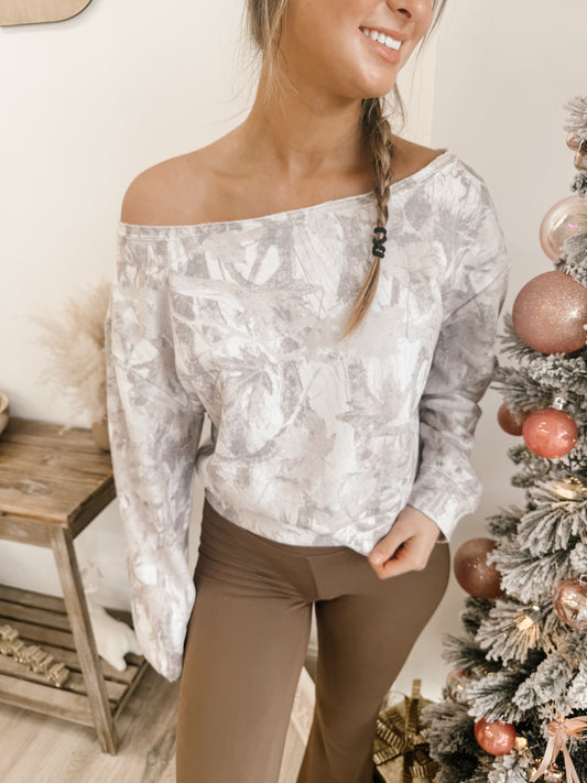 Fleece Camo Off-shoulder Long Sleeve Cropped Top