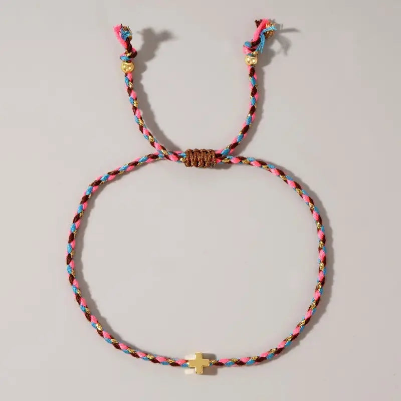 18K Stainless Steel Tarnish-Free Charm Bracelet with cotton Colorful Rope Chain with multi charms. Charm Bracelet, featuring cross on a fashionable rope chain, its tarnish-free design ensures long-lasting shine and resilience, the bracelet is hypoallergenic, waterproof, fade-resistant, and tarnish-free. Product Details: length: 7" clasp: Clasp Metal finish: Stainless Steel 18K Gold product: Lead & Nickel Compliant anti-tarnish: Tarnish Free, Non-Tarnish