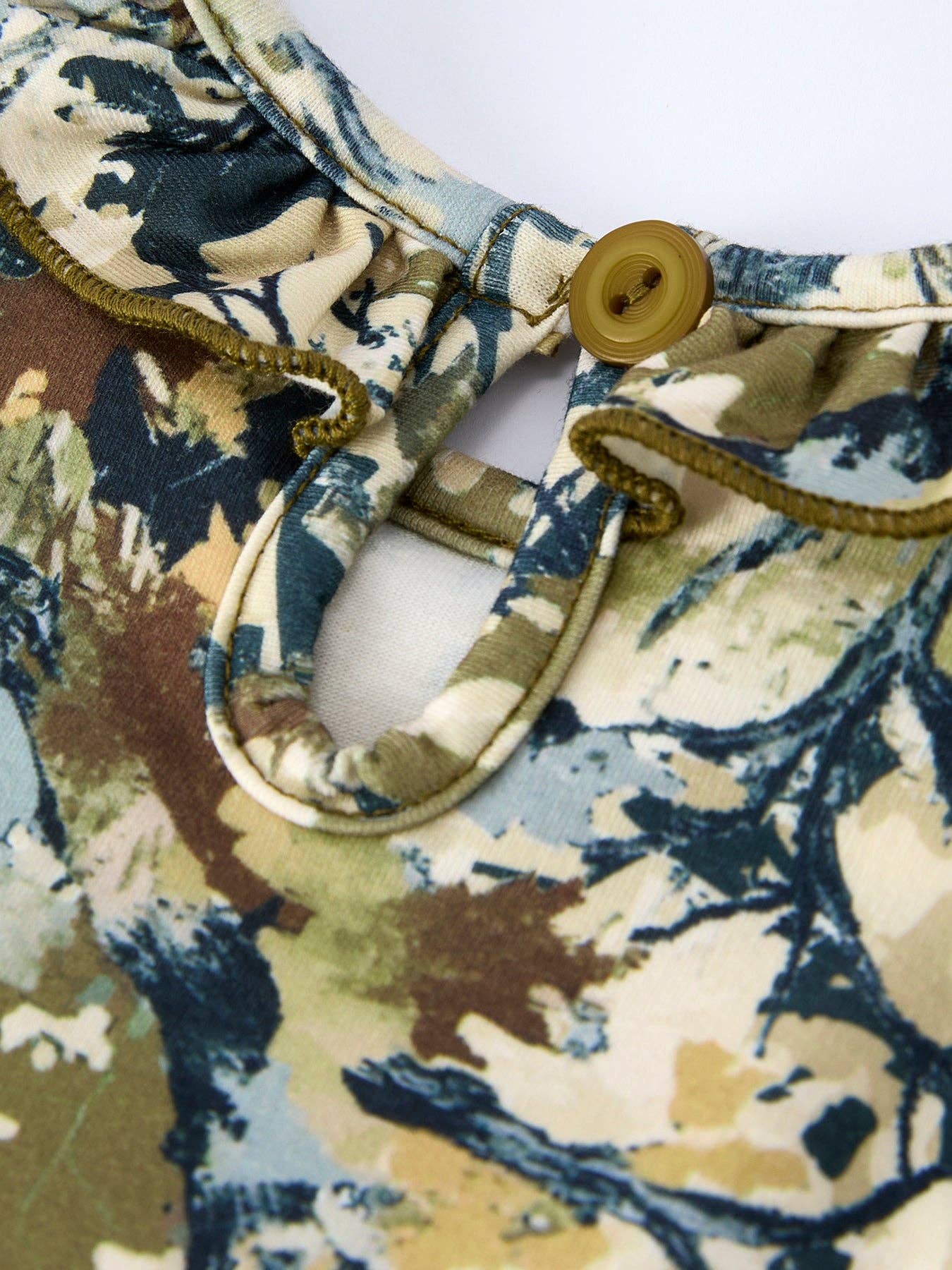 This charming baby girls romper blends unexpected style with heirloom-quality craftsmanship. Featuring delicate smocking embroidery paired with a playful duck camouflage print, it's a statement piece that stands out from typical baby fashion. The thoughtfully constructed design ensures comfort for active little ones while the intricate needlework adds sophistication parents will appreciate. Ideal for celebrations, portraits, or making everyday moments feel special. A timeless investment piece that captures childhood charm with modern flair.