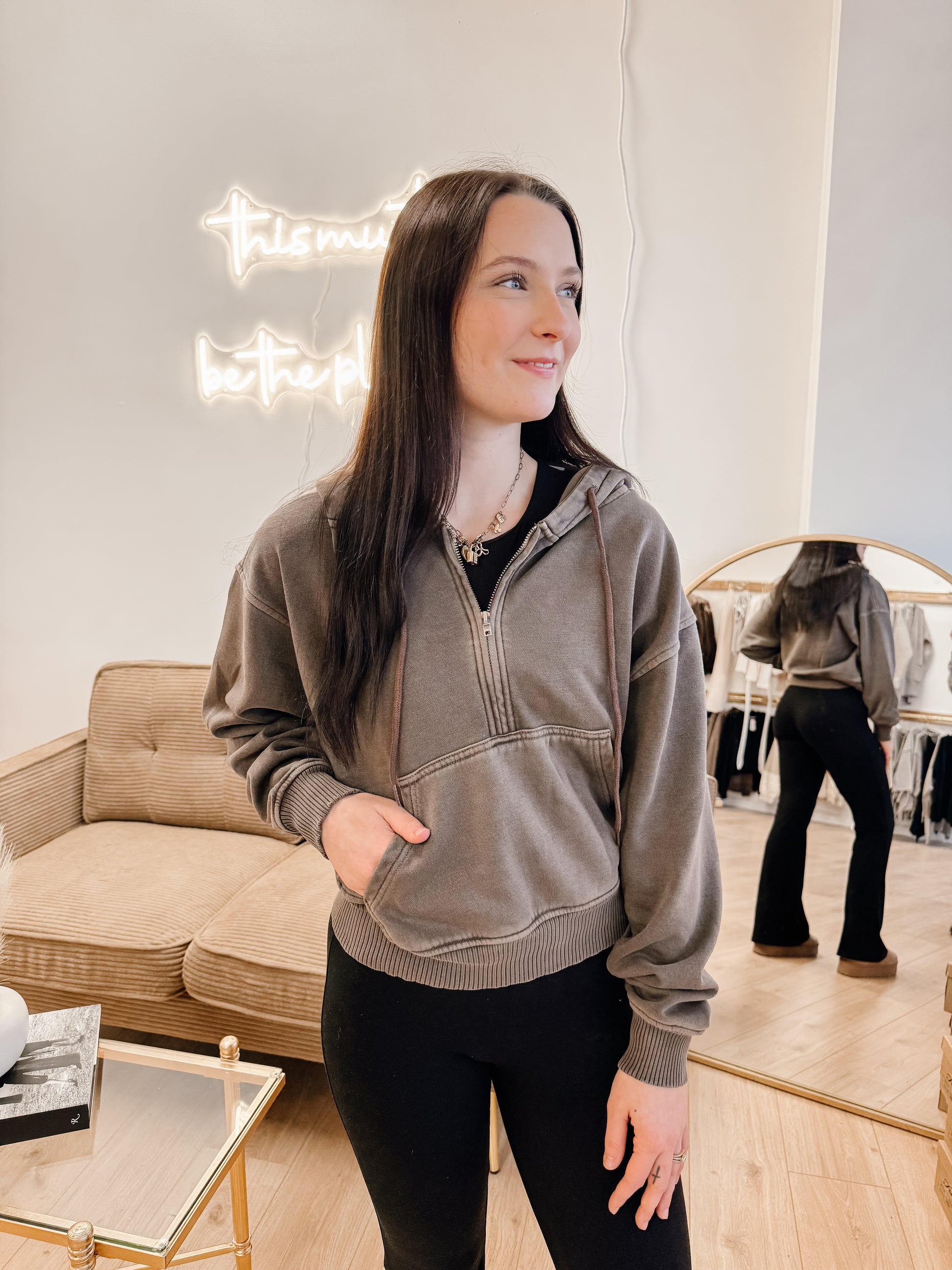 Fleece Pigment Dye Half Zip Kangaroo Pocket Hoodie