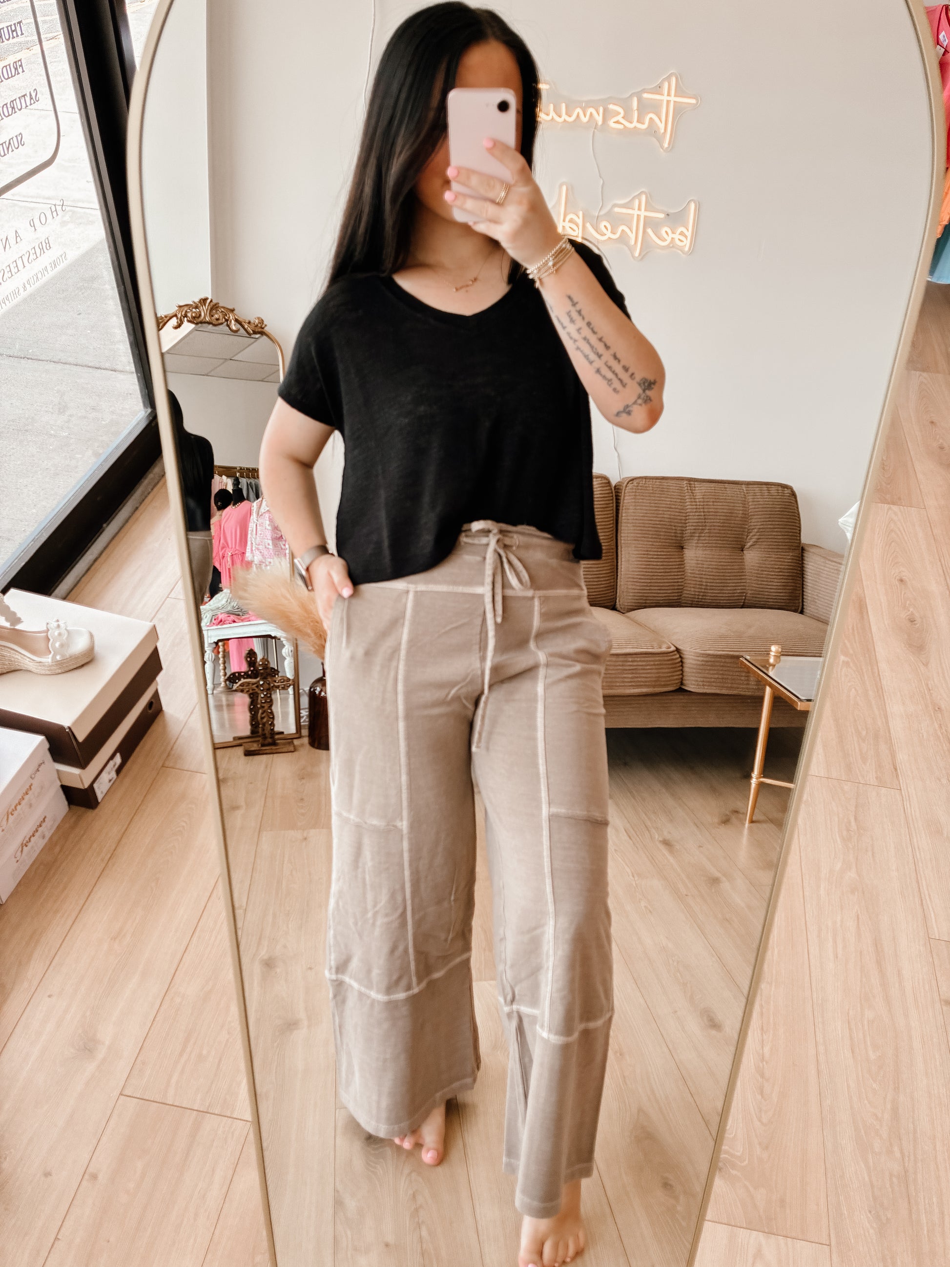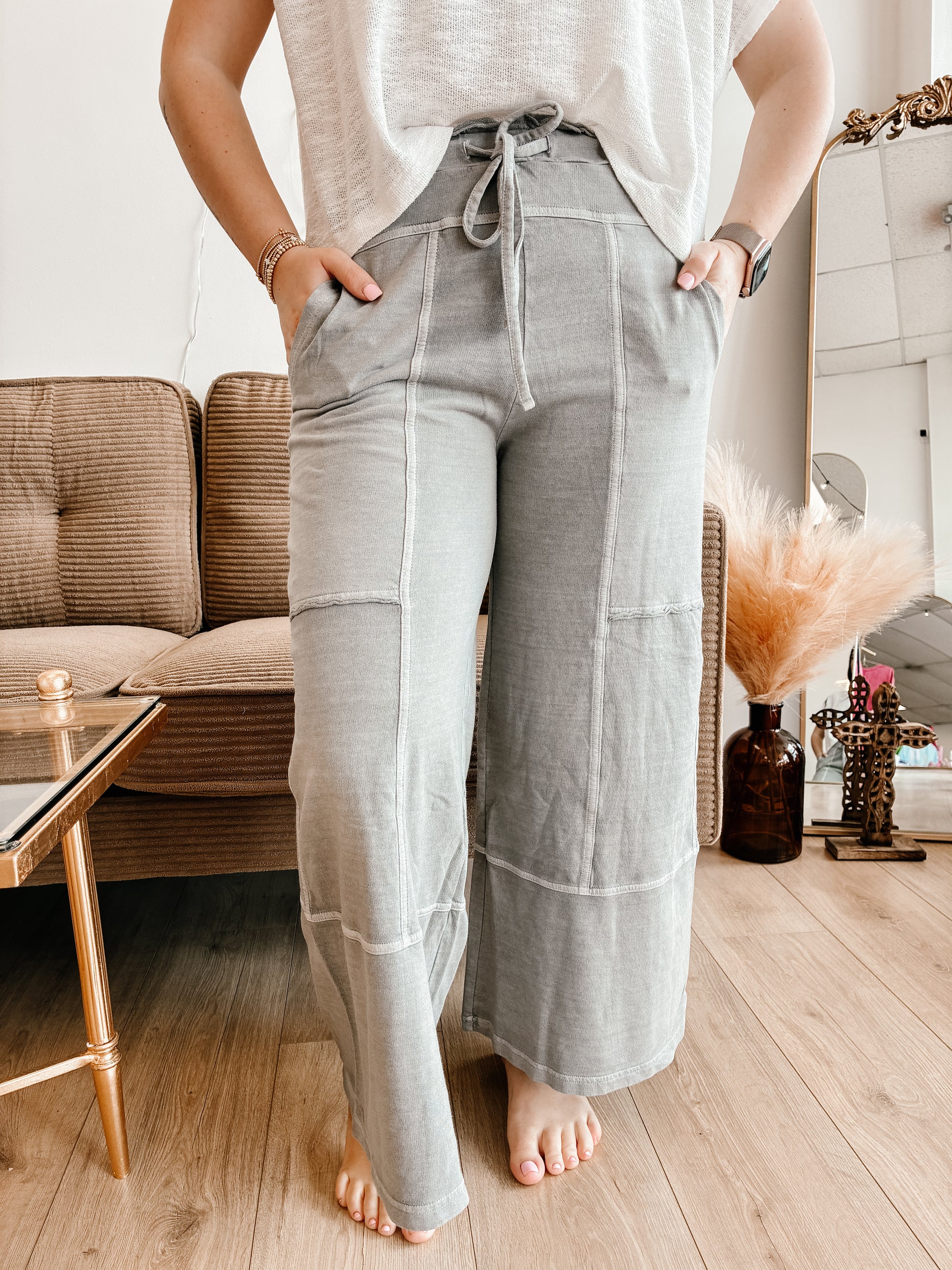 FRENCH TERRY WASHED EXPOSED-SEAM WIDE LEG PANTS - PIGMENT DYE+ENZYME WASHING - DRAWSTRING BAND WAIST - POCKETS
