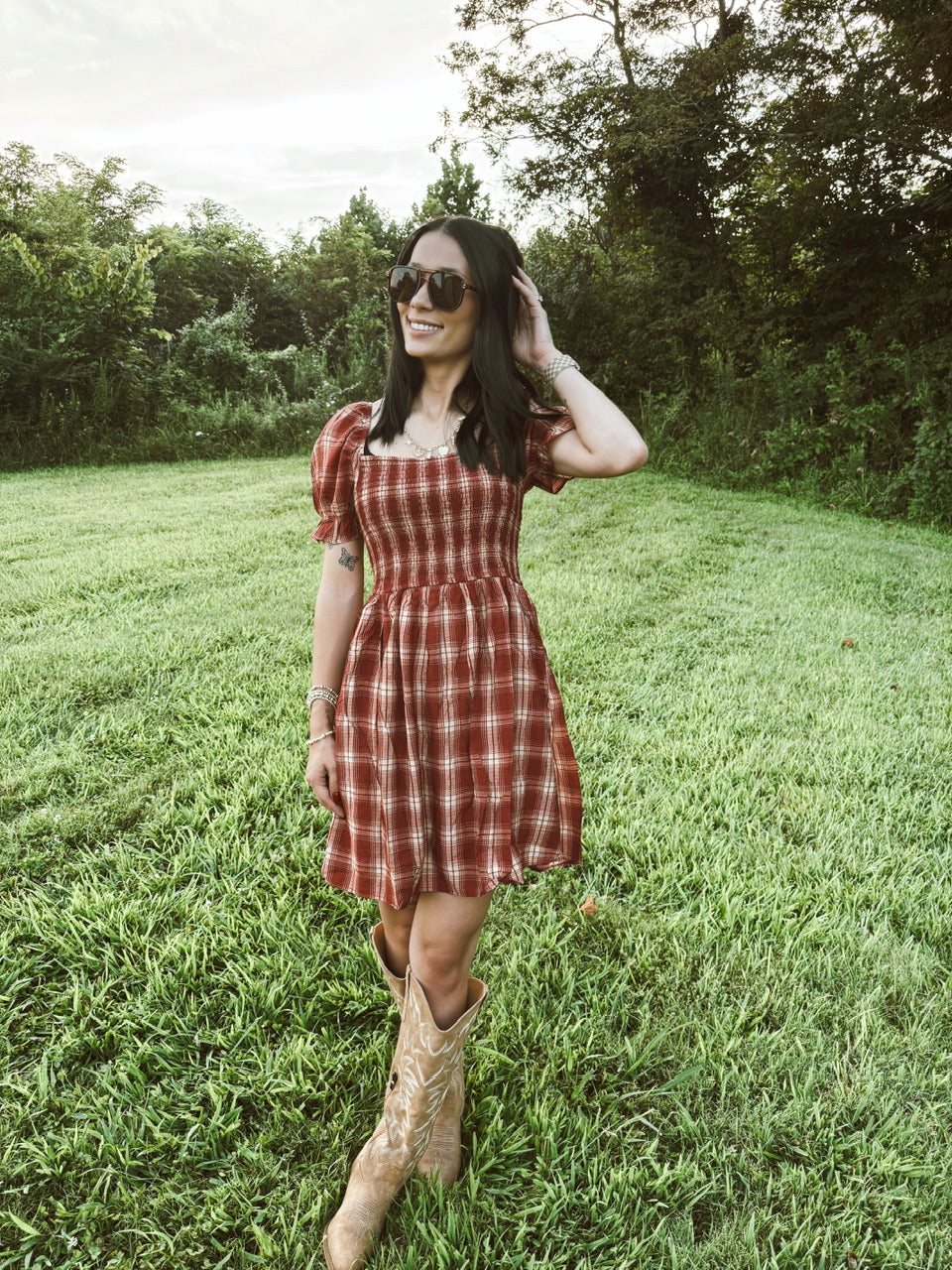 SQUARE NECKLINE SHORT PUFF SLEEVES ELASTIC CUFFS SMOCKED A-LINE MINI DRESS PLAID PATTERN SHELL: 82% RAYON 18% NYLON LINING: 100% POLYESTER