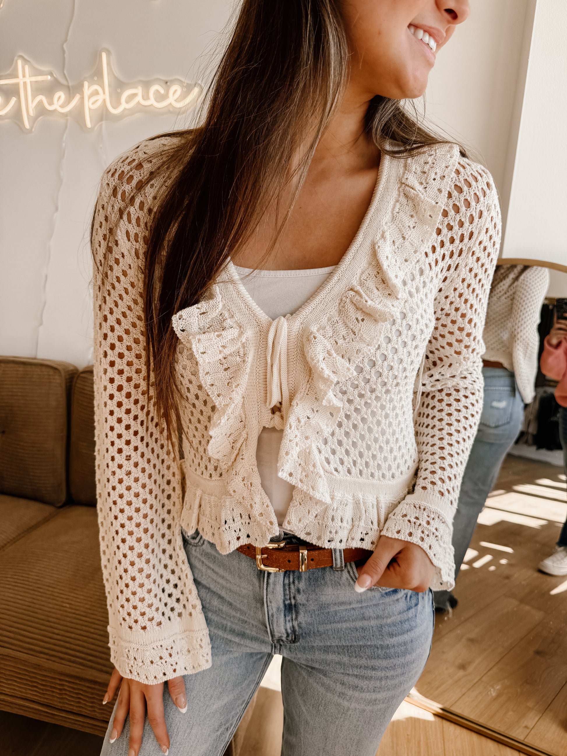 Turn heads in this ruffle tie-front crochet knit top, crafted with an open-knit design and vintage-inspired flair. Featuring flared sleeves, delicate ruffle trim, and adjustable front ties, it's perfect for layering over tanks or bralettes. A lightweight, breezy style ideal for festivals, beach days, or casual chic looks. KEY FEATURES: Open crochet knit Ruffle trim neckline Adjustable tie-front closure Flared long sleeves Breathable, lightweight design
