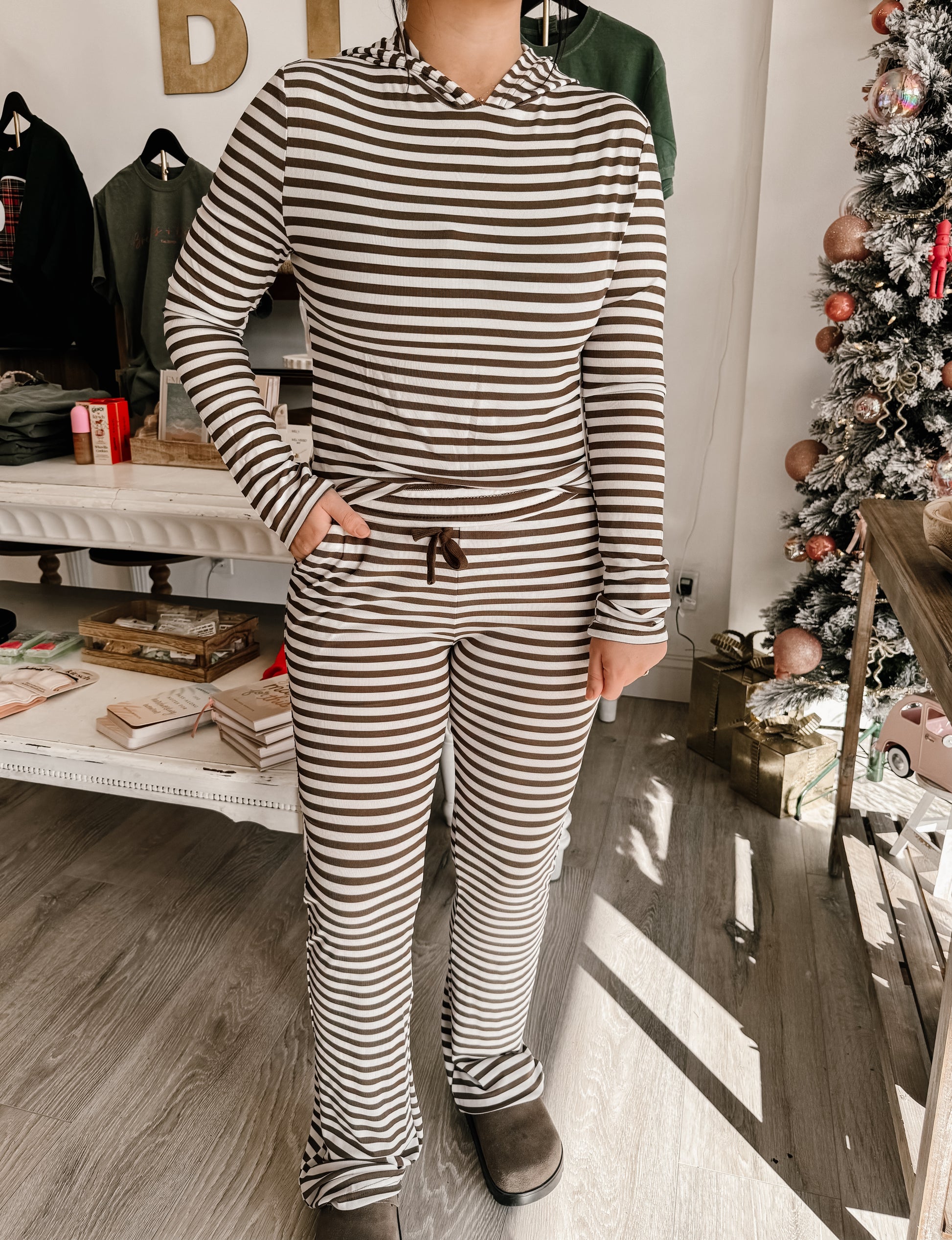 This soft modal striped pant is all about that comfy, laid-back vibe, with a mid-rise fit and flare leg that's perfect for lounging. The elastic drawstring waistband makes it an easy, go-to pant for any day.